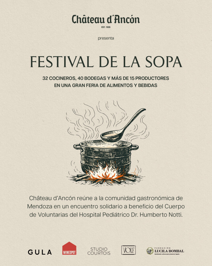 El domingo 10 de mayo, desde las 12 h, en el Camino de Nogales de Château d’Ancón (Tupungato, Mendoza), se realizará el Festival de la Sopa. Participarán 32 cocineros, 40 bodegas y más de 15 productores de alimentos y bebidas. Todo lo recaudado será destinado al Cuerpo de Voluntarias del Hospital Pediátrico Dr. Humberto Notti.