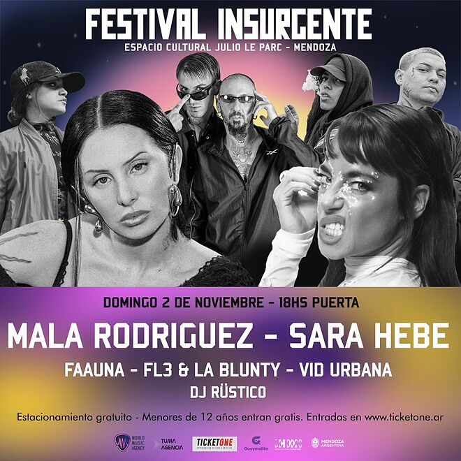El Festival Insurgente llega a Mendoza con un line up explosivo que reunirá en un mismo escenario a grandes referentes y talentos emergentes de la música urbana. La histórica visita de Mala Rodríguez, pionera y referente del rap en español, se combina con Sara Hebe, la artista argentina que atraviesa un gran momento en su carrera. Junto a ellas, proyectos locales como Faauna -con gran recorrido nacional e internacional-, FL3 & La Blunty y Vid Urbana prometen ritmo, baile y fusión de géneros, desde rap y cumbia digital hasta electrónica y beats urbanos.