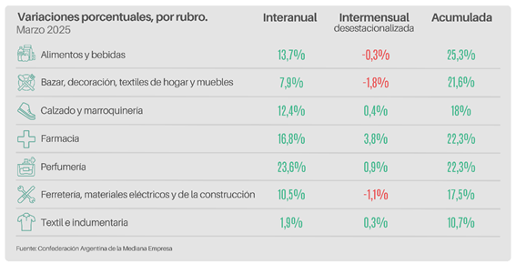 En marzo, los siete rubros relevados registraron subas interanuales en sus ventas. El mayor incremento se detectó en Perfumería (+23,6%), seguido por Farmacia (+16,8%) y Alimentos y Bebidas (+13,7%). En el acumulado del trimestre, lidera Alimentos y Bebidas con un aumento de +25,3%.