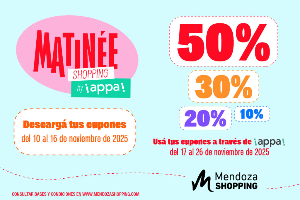 Matinée Shopping es una acción comercial del Mendoza Shopping que ofrece descuentos de hasta el 50% en una amplia variedad de rubros: indumentaria urbana y deportiva, calzado, hogar, belleza, tecnología y más.